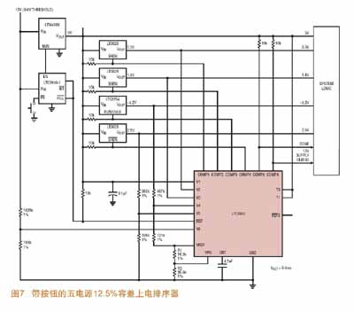 各個(gè)比較器輸出還提供了電源排序。圖7示出了LTC2932在一個(gè)五電源上電排序器中的應(yīng)用。當(dāng)一個(gè)輸入達(dá)到其門限時(shí),相應(yīng)的比較器輸出將被拉至高電平,并啟用下一個(gè)DC/DC轉(zhuǎn)換器。