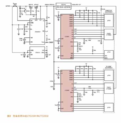 LTC2930、LTC2931和LTC2932監(jiān)控器容易使用,并具有寬工作溫度范圍和低電源電流要求,因而使其成為汽車應(yīng)用的理想選擇。圖8示出了一種采用LTC2931和LTC2932的汽車應(yīng)用方框原理圖。它是專為凸顯和利用這些器件除簡(jiǎn)單的電壓監(jiān)視以外的諸多特點(diǎn)而設(shè)計(jì)的。電壓監(jiān)視器由LT3010-5 (一款固定5V微功率線性穩(wěn)壓器) 來(lái)供電。電壓瞬變保護(hù)由LT4356DE-1過(guò)壓保護(hù)穩(wěn)壓器和浪涌限幅器來(lái)提供。