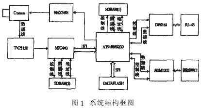 AT91RM9200 通過(guò)片內(nèi)的SPI 總線(xiàn)和SDRAM控制器實(shí)現(xiàn)對(duì)外圍DataFlash 和SDRAM的控制, 利用片內(nèi)的USART 實(shí)現(xiàn)對(duì)串口芯片的控制, 通過(guò)片內(nèi)的以太網(wǎng)控制器對(duì)片外網(wǎng)絡(luò)芯片進(jìn)行控制。其控制原理圖如圖2 所示。