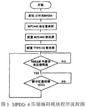 該模塊主要完成MPG440 和TI5150 相關(guān)寄存器的配置, 并保證MPEG- 4 碼流的正常輸出。當(dāng)嵌入式Linux系統(tǒng)啟動(dòng)后,首先配置MPG440 的相關(guān)寄存器, 其初始化完成后, 通過(guò)I2C總線(xiàn)對(duì)TVP5150 進(jìn)行初始化配置。當(dāng)系統(tǒng)開(kāi)始?jí)嚎s編碼時(shí),MPEG- 4 碼流接收存儲(chǔ)程序由MPEG- 440 的數(shù)據(jù)流緩沖器標(biāo)志信號(hào)控制。當(dāng)1024b 緩沖器滿(mǎn)時(shí), RISC_INT0 置于低電平, 微控制器通過(guò)DMA通道從MPG440 的HPI 口將碼流送到PC 機(jī)端。MPEG-4 壓縮編碼模塊程序流程如圖4 所示。