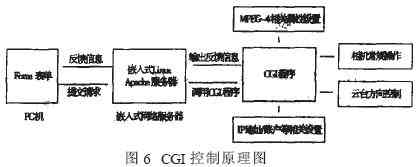 CGI(Common Gateway Interface) 是外部擴(kuò)展應(yīng)用程序與WWW 服務(wù)器交互的一個(gè)標(biāo)準(zhǔn)接口。本系統(tǒng)CGI 的工作過(guò)程: 在PC 機(jī)端的IE 瀏覽器中輸入網(wǎng)絡(luò)攝像機(jī)IP 地址, 嵌入式網(wǎng)絡(luò)服務(wù)器根據(jù)請(qǐng)求, 將相應(yīng)的控制頁(yè)面反饋給IE 瀏覽器, 用戶(hù)填寫(xiě)表單, 然后提交, CGI 程序提取表單的信息, 根據(jù)不同信息來(lái)分別處理相應(yīng)的事件, 如調(diào)節(jié)MPEG- 4 相關(guān)屬性、相機(jī)的相關(guān)操作等。CGI 控制原理如圖5 所示。