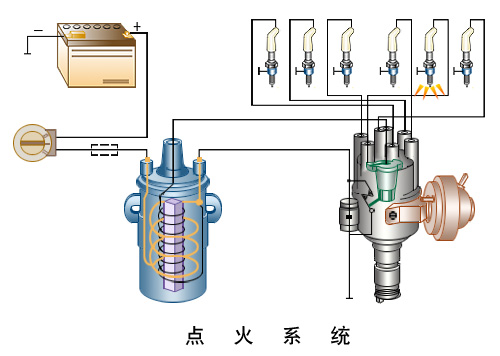 在汽油機(jī)中,氣缸內(nèi)的可燃混合氣是靠電火花點(diǎn)燃的,為此在汽油機(jī)的氣缸蓋上裝有火花塞,火花塞頭部伸入燃燒室內(nèi)。能夠按時(shí)在火花塞電極間產(chǎn)生電火花的全部設(shè)備稱為點(diǎn)火系,點(diǎn)火系通常由蓄電池、發(fā)電機(jī)、分電器、點(diǎn)火線圈和火花塞等組成。