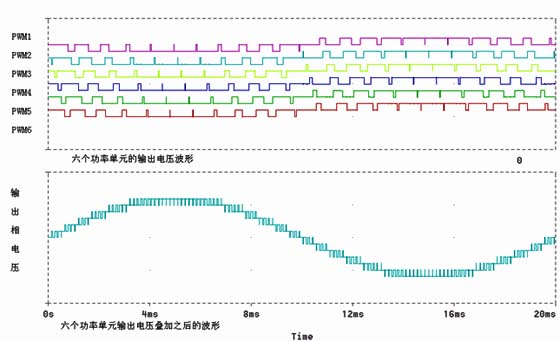 每個(gè)單元輸出PWM波,將每相N功率單元的輸出電壓疊加,產(chǎn)生多重化的相電壓波形,使相電壓產(chǎn)生出2N+1個(gè)電壓臺階,六個(gè)功率單元輸出的PWM波形及疊加之后的相電壓波形如圖4所示。