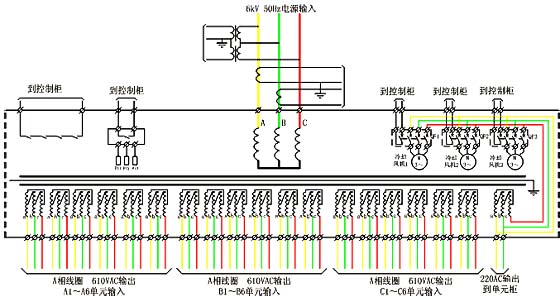 移相變壓器電氣原理如圖5所示: 變壓器(以輸入6kV變壓器為例)原邊繞組為6kV, 副邊共十八個(gè)繞組分為三相。每個(gè)繞組為延邊三角形接法,分別有±5o 、±15o 、±250等移相角度,每個(gè)繞組接一個(gè)功率單元。這種移相接法可以有效地消除35次以下的諧波。因此,采用移相變壓器進(jìn)行隔離降壓,不會對電網(wǎng)造成超過國家標(biāo)準(zhǔn)的諧波干擾。