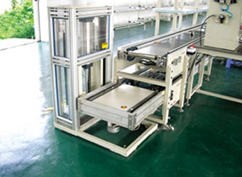 差速鏈為摩擦傳動(dòng)鏈條,其鏈條的滾輪為摩擦傳動(dòng),同時(shí)支撐裝配線的輸送托盤,因滾輪線速度(托盤輸送速度)大于鏈條的速度,故名差速鏈。這種輸送線一般同時(shí)采用兩條鏈條進(jìn)行輸送,發(fā)動(dòng)機(jī)由托盤支撐,托盤放置在鏈條差速鏈上進(jìn)行輸送。這種輸送線在電視機(jī)、電冰箱裝配中應(yīng)用較多,受差速鏈承載能力的限制,一般只應(yīng)用于小型發(fā)動(dòng)機(jī)的裝配輸送。