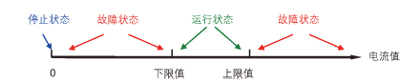 為了讓MES中的監(jiān)控計算機(jī)或人機(jī)界面能更形象準(zhǔn)確地顯示工藝設(shè)備整體及其各裝置的運(yùn)行狀態(tài),現(xiàn)場控制系統(tǒng)必須對電機(jī)、水泵和傳感器等的運(yùn)行或通斷狀態(tài)進(jìn)行檢測和判斷。這就需要增設(shè)相應(yīng)的檢測元件,如編碼器,可直接檢測電機(jī)是否運(yùn)行;光電開關(guān),可檢測工件是否通過或占位;測距開關(guān),可以檢測移動設(shè)備行進(jìn)距離;壓力開關(guān),可以檢測是否過載;風(fēng)速儀,可以間接檢測風(fēng)機(jī)運(yùn)行與否;接近開關(guān),可間接反映設(shè)備間同步狀態(tài);電流表,可間接反映電機(jī)運(yùn)行狀態(tài)等。當(dāng)采用間接方式時,需配合軟件來實現(xiàn)其功能,例如,通過檢測電機(jī)運(yùn)行電流(不包括起動過程)可以間接判斷其是否處于運(yùn)行狀態(tài)。圖2所示的坐標(biāo)反映電機(jī)的運(yùn)行電流。上下限值根據(jù)電機(jī)實際工作中負(fù)載的變化范圍而確定,當(dāng)電機(jī)運(yùn)行電流在上下限之間時,可認(rèn)為電機(jī)處于運(yùn)行狀態(tài),電流為零則處于停止?fàn)顟B(tài),其他區(qū)間為故障狀態(tài)。