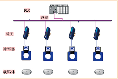 車體識別是MES的重要組成部分。目前的常用作法是采用RFID技術(shù)將識別系統(tǒng)融入到控制系統(tǒng)中。RFID的典型網(wǎng)絡(luò)構(gòu)架見圖5。數(shù)據(jù)載體在車間的入口處被寫入加工安裝信息并隨工件行進(jìn),各工位根據(jù)從數(shù)據(jù)載體中讀到的信息完成工藝作業(yè),然后再將必要的過程信息寫入數(shù)據(jù)載體。一般情況下,在重要工藝段前后及分類道岔前必須設(shè)置讀寫站。