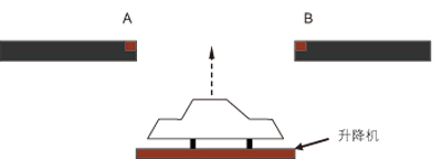 在構(gòu)建了MES的生產(chǎn)車間里,傳感器的冗余設(shè)置是十分必要的。冗余不僅可以提高設(shè)備運(yùn)行的可靠性和效率,還能為故障判斷創(chuàng)造便利條件。一般情況下,在升降機(jī)、移行機(jī)和翻轉(zhuǎn)機(jī)等關(guān)鍵部位都要對位置檢測傳感器進(jìn)行冗余設(shè)置以降低撞車、掉車等的概率,減少因傳感器故障造成的停產(chǎn),此外,還可以相互成為故障診斷的參照物。以升降機(jī)為例,圖6中,A與B為冗余設(shè)置的檢測上升到位的傳感器,正常情況下,A與B同時動作,工件被水平輸送,如A與B不同時動作,可診斷為A或B處于故障狀態(tài),應(yīng)暫停輸送。