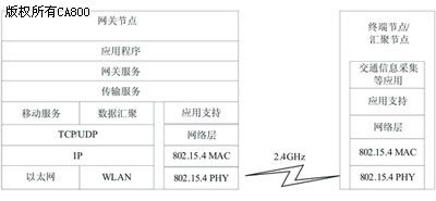 在ITS無線傳感器網(wǎng)絡(luò)的設(shè)計中,網(wǎng)絡(luò)節(jié)點按照功能不同,需要分別進(jìn)行設(shè)計。終端節(jié)點、匯聚節(jié)點和網(wǎng)關(guān)節(jié)點的軟件功能如圖3所示。終端節(jié)點安裝不同的傳感器用于運動車輛信息采集和道路信息獲取等。其功能實現(xiàn)可按照精簡功能設(shè)備(RFD,ReducedFunctionDevice)標(biāo)準(zhǔn)來實現(xiàn)。終端節(jié)點與匯聚節(jié)點按照星型網(wǎng)絡(luò)組網(wǎng),在固定時間點由睡眠狀態(tài)醒來與匯聚節(jié)點主動通訊。信息路由則交給父(匯聚)節(jié)點及網(wǎng)絡(luò)中具有路由功能的協(xié)調(diào)器和路由器完成,降低了節(jié)點功耗和軟件實現(xiàn)復(fù)雜度。匯聚節(jié)點是終端節(jié)點軟件功能上的擴(kuò)展,實現(xiàn)了擴(kuò)展網(wǎng)絡(luò)及路由消息的功能,允許更多重點節(jié)點接入網(wǎng)絡(luò)??砂凑杖δ茉O(shè)備(FFD,F(xiàn)ullFunctionDevice)標(biāo)準(zhǔn)進(jìn)行設(shè)計。