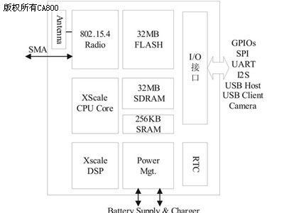 在設(shè)計無線傳感器網(wǎng)絡(luò)網(wǎng)關(guān)時,需要較強的數(shù)據(jù)處理能力,用以實現(xiàn)復(fù)雜路由協(xié)議以及信息處理等。如圖5所示Crossbow的imote2節(jié)點采用了MarvellPXA271高性能、低功耗處理器。該處理器使用動態(tài)電壓調(diào)節(jié)技術(shù),頻率范圍13MHz~416MHz,可工作于低電壓(0.85V)低頻率(13MHz)模式,具備了優(yōu)良的動態(tài)電源管理技術(shù)。此外,該處理器封裝內(nèi)集成三個芯片256KBSRAM,32MBFLASH以及32MBSDRAM,減小了體積。通過提供多種I/O,能夠靈活的支持不同種類的傳感器。該處理器還支持一個MMX協(xié)處理器,提高多媒體處理能力,可以用于無線多媒體傳感器網(wǎng)絡(luò)中的語音和圖像處理。Imote2使用TI的CC2420ZigBee射頻芯片,支持2.4GHz、16通道250kb/s數(shù)據(jù)傳輸,發(fā)送功率-24~0dBm。有效通訊距離是30米,可以通過SMA接口外接天線來增加傳輸距離。