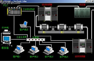 該套系統(tǒng)控制部分核心是Rockwell Automation的ControlLogix 系列PLC控制器,上位采用研華工業(yè)控制計算機,人機界面采用RockwellAutomation 的RS View SE組態(tài)軟件。系統(tǒng)采用Client/Server架構,多臺客戶機可以在不同位置通過Ethernet訪問服務器,并且控制各個受控部件進行變頻器測試。