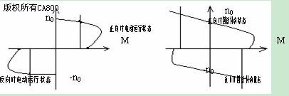 根據(jù)工藝要求,轉(zhuǎn)爐的傾動(dòng)角度為正反360°。轉(zhuǎn)爐爐口和爐底方向軸線與地平面垂直時(shí)為零位狀態(tài)。故爐子傾動(dòng)負(fù)載力矩為角度的函數(shù)Mfz=f(θ) ,屬于反陰性的位能負(fù)載。另外,據(jù)工藝設(shè)計(jì)說明,轉(zhuǎn)爐按正力矩設(shè)計(jì),即爐子耳軸下部比上部高,下部比上部重。從而確保轉(zhuǎn)爐電控系統(tǒng)失靈或抱閘力不夠時(shí),能靠爐體自身的正力矩來確保爐口向上,這樣不至于發(fā)生倒鋼等事故。但當(dāng)維修爐拆除爐底后以及爐口粘鋼渣太多時(shí),爐體可能出現(xiàn)上部較下部重,由于液體鋼水重心隨轉(zhuǎn)爐傾角的變化而變化,這樣在修爐和出渣或出鋼時(shí),可能出現(xiàn)負(fù)力矩。當(dāng)爐體處于正力矩狀態(tài)時(shí),電動(dòng)機(jī)處于電動(dòng)運(yùn)行狀態(tài),當(dāng)爐體處于負(fù)力矩狀態(tài)時(shí),電動(dòng)機(jī)處于回饋制動(dòng)狀態(tài),電動(dòng)機(jī)的機(jī)械特性和負(fù)載特性如圖2 。