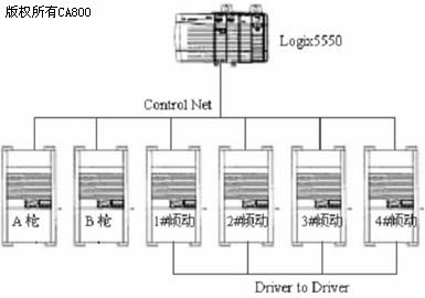 在轉(zhuǎn)爐傳動(dòng)變頻控制系統(tǒng)中,4臺(tái)變頻器通過光纖連接,構(gòu)成主從應(yīng)用工作組,工作時(shí)其中一臺(tái)設(shè)為主傳動(dòng)工作方式,另三臺(tái)工作在從傳動(dòng)方式,從傳動(dòng)變頻器以轉(zhuǎn)矩模式工作,主變頻器速度由PLC系統(tǒng)通過變頻器I/O口給定,主變頻器通過Drive-to-Drive Link通訊向從機(jī)發(fā)送運(yùn)行信息,內(nèi)容包括主機(jī)轉(zhuǎn)速,轉(zhuǎn)矩及開關(guān)狀態(tài)等,由主從裝置參數(shù)設(shè)定自動(dòng)實(shí)現(xiàn)與主傳動(dòng)的速度/轉(zhuǎn)矩跟蹤和轉(zhuǎn)矩準(zhǔn)確分配,實(shí)現(xiàn)了多電機(jī)傳動(dòng)中速度同步和轉(zhuǎn)矩分配。