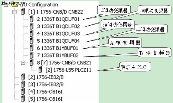 根據(jù)傾動(dòng)機(jī)構(gòu)工藝要求及控制功能,每座轉(zhuǎn)爐傾動(dòng)變頻系統(tǒng)配置了一套相對(duì)獨(dú)立的PLC(1#轉(zhuǎn)爐為PLC12)系統(tǒng),通過控制總線Control Net網(wǎng)絡(luò)接口實(shí)現(xiàn)轉(zhuǎn)爐變頻器及PLC間的通訊(如圖3), 同時(shí)實(shí)現(xiàn)與轉(zhuǎn)爐主PLC(1#轉(zhuǎn)爐為PLC11)系統(tǒng)的通訊(如圖4)。系統(tǒng)主要硬件配置如下: