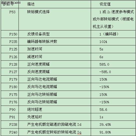 由于變頻器功能參數(shù)很多,實(shí)際應(yīng)用中,沒有必要對(duì)每一參數(shù)進(jìn)行設(shè)置和調(diào)試,多數(shù)可采用缺省值,有些參數(shù)可以通過做AUTOTUNE后產(chǎn)生,例如:速度調(diào)節(jié)器和滑差調(diào)節(jié)器的PID參數(shù)、額定轉(zhuǎn)速和額定電流下的Q軸和D軸電壓、電機(jī)的額定和最大最小滑差頻率等等,不需人工設(shè)定。而有些參數(shù)則要根據(jù)電機(jī)的負(fù)載特性和功能來設(shè)定,主要設(shè)置的參數(shù)為電機(jī)銘牌參數(shù),極限參數(shù)(包括速度和電流),定標(biāo)參數(shù),鏈接參數(shù)和通訊口等。另外,更換同型號(hào)電機(jī)后,可以繼續(xù)使用原有參數(shù)而不需要改變。但反饋類型改變后,由于對(duì)整個(gè)系統(tǒng)的影響較大,需要重新做AUTOTUNE。根據(jù)傾動(dòng)電機(jī)工藝參數(shù)和相關(guān)特性,表1列出了1#傾動(dòng)變頻器部分參數(shù)的設(shè)置。