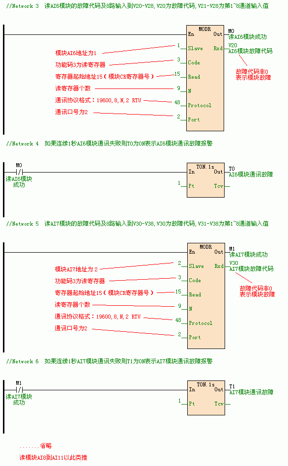 1、 遠(yuǎn)程IO采集及遠(yuǎn)程站故障報(bào)警:使用Modbus讀指令MODR將每個(gè)遠(yuǎn)程IO模塊的8個(gè)通道值及故障代碼讀到PLC主機(jī)中,故障代碼非0則報(bào)模塊故障,與模塊通訊失敗連續(xù)1秒則報(bào)與該模塊通訊失敗