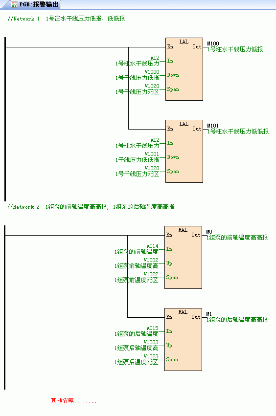 2、 高報(bào)、高高報(bào)、低報(bào)、低低報(bào):海為PLC提供了高限報(bào)警HAL和低限報(bào)警LAL指令,2條高報(bào)實(shí)現(xiàn)高高報(bào),2條低報(bào)實(shí)現(xiàn)低低報(bào),HAL和LAL指令與一般比較指令不同,它帶死區(qū)功能避免了數(shù)值波動(dòng)引起的報(bào)警頻繁跳動(dòng)