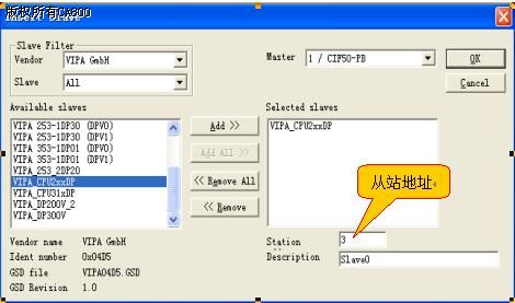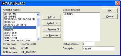 (5)、在“Available masters”中選擇使用到的CIF50-PB,并雙擊或點擊“Add”,添加到“Selected masters”中,再點擊“OK”;