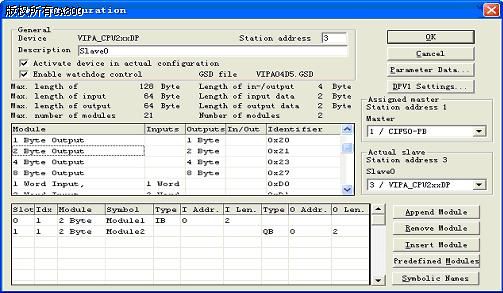 (8)、配從站的模塊,本試驗中輸入、輸出各加了2個字節(jié),如下圖所示;