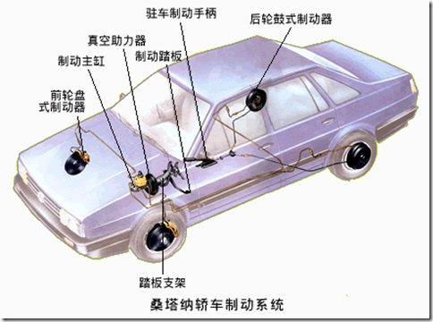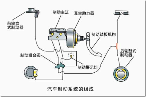 1)行車制動(dòng)系統(tǒng)——使行駛中的汽車減低速度甚至停車的一套專門(mén)裝置。
