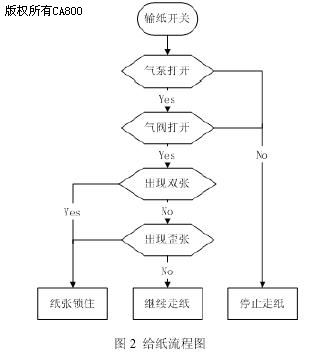 印刷機(jī)整體的電氣設(shè)計(jì)對(duì)時(shí)間的要求嚴(yán)格,在機(jī)器的很多地方裝有接近開關(guān),用來檢測(cè)不同的時(shí)間點(diǎn)。在印刷過程中,走紙的好壞是影響機(jī)器質(zhì)量的一個(gè)重要環(huán)節(jié)。所謂紙走的好壞,指的是無歪張,雙張等現(xiàn)象,如果有歪張,雙張現(xiàn)象,在高速情況下,就會(huì)將走壞的紙,卷入機(jī)器內(nèi),從而破壞膠皮,給用戶帶來很大損失。給紙過程的流程,如圖2所示: