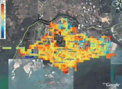 A spatial histogram overlays a grid on a geographic region, allowing Daimler to bin a signal of interest and depict it on a satellite geographic map. Figure 4 shows a spatial histogram of Singapore based on fuel tank SOC. The histogram in Figure 5 calculates the percentage of time the vehicles spend in each grid square. Combining these types of diagrams helps to pinpoint areas that are heavily trafficked by vehicles that are low on fuel.
