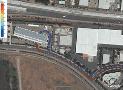 Figure 2. Fuel consumption analysis. In this example we see the test car leaving the fueling station with a full tank (red) and returning with a nearly empty tank (blue). Click on image to see enlarged view.