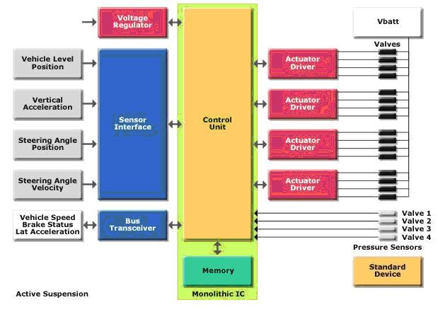 如圖三所示,主動式懸掛系統(tǒng)(Active Suspension)也是汽車中比較常見的安保系統(tǒng),其可大幅提高車輛的操控性。主動式懸掛系統(tǒng)主要由傳感器、減震筒及計算機控制系統(tǒng)等組成。該系統(tǒng)可采集汽車的速度、加速度、負重、轉(zhuǎn)向程度、左右G力等數(shù)據(jù)來由程序?qū)覓煜禂?shù),和底盤與地面的高度等進行實時調(diào)整。