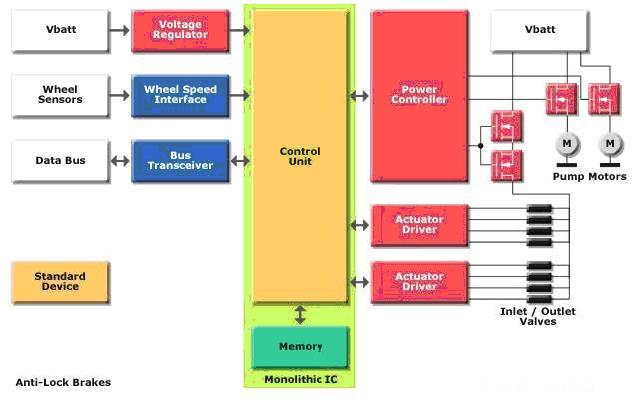 越來越多地國家的法律法規(guī)對防抱死煞車系統(tǒng)(Anti-lock Brake Systems, ABS)的性能提出了要求,對其可靠性的更高要求增加了ABS設計的復雜程度和研發(fā)難度。如圖四所示系統(tǒng)中,ABS的主要目的是防止車輛失速滑行的危險情況,當控制環(huán)節(jié)發(fā)現(xiàn)緊急剎車導致轉(zhuǎn)速過低時,會迅速點放剎車,給予輪胎足夠的滾動空間和更大的抓地力,防止車輛跑偏。該系統(tǒng)的關鍵是輪胎轉(zhuǎn)速的測量。