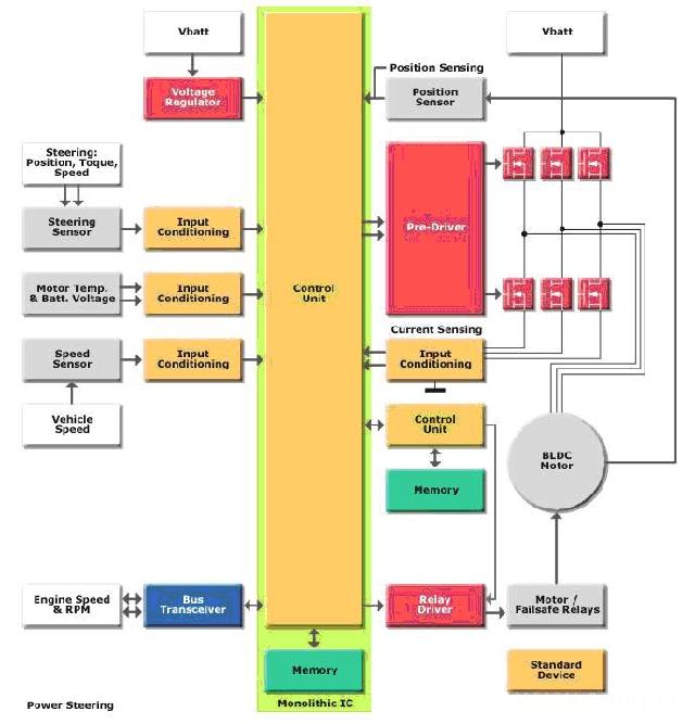 圖五所示系統(tǒng)為電子式動力輔助方向盤(Electric Power Assisted Steering, EPAS)系統(tǒng),簡稱動力方向盤。相對于傳統(tǒng)的油壓式方向盤,EPAS采用電子式馬達來為駕駛人員提供車輪轉(zhuǎn)向的輔助控制。EPAS一般由傳感器獲得方向盤的位置、扭矩,再結合車速、發(fā)動機溫度、電池供電情況等參數(shù)實現(xiàn)電子式馬達的輔助控制。EPAS目前已逐漸進入市場,其不但能使引擎負載降低,還能進一步改善燃油的使用效率。