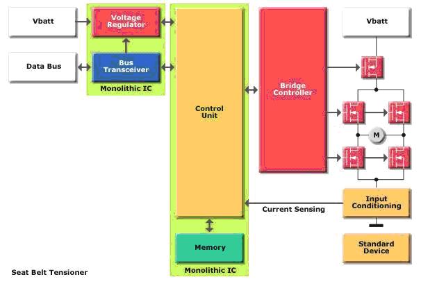 首先以安全氣囊(Airbag)控制系統(tǒng)為例。該系統(tǒng)主要由駕駛員及乘客面前的安全氣囊,位于車身外的沖撞傳感器(Satellite Sensor),安置于車門、座位和車頂?shù)任恢玫募铀俣葌鞲衅鳎℅-Sensor),以及通常為16位或32位MCU的ECU等幾部分組成。當車身受到碰撞,沖撞傳感器會立即向ECU發(fā)出信號,ECU則會收集碰撞強度、座椅位置、乘客重量、安全帶情況等參數(shù)來進行迅速評估,并在極短的時間內(nèi)通過電爆驅(qū)動器(Squib Driver)打開安全氣囊來保護車內(nèi)人員的安全。