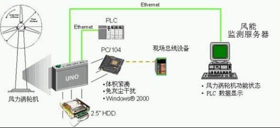 風(fēng)力發(fā)電系統(tǒng)通常安裝在帶 有灰塵和大風(fēng)的惡劣環(huán)境中。在這樣的環(huán)境中,使用一臺(tái)有風(fēng)扇的PC為主機(jī)平臺(tái)將會(huì)導(dǎo)致風(fēng)扇和系統(tǒng)故障。客戶需要一套可靠的計(jì)算機(jī)平臺(tái),不僅平均無故障時(shí)間長(zhǎng),而且要求是一套緊湊的平臺(tái)。經(jīng)過考察客戶選用了 UNO-2170做為風(fēng)電控制器的數(shù)據(jù)網(wǎng)關(guān)。