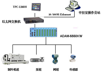 經(jīng)過對(duì)需求的仔細(xì)研究,為了保證系統(tǒng)運(yùn)行的可靠性、安全性,本系統(tǒng)采用兩層架構(gòu):上位機(jī)客戶決定選用研華自動(dòng)化的TPC-1261H觸摸式工業(yè)電腦,下位機(jī)采用研華自動(dòng)化的可編程自動(dòng)化控制器ADAM-5550KW,實(shí)現(xiàn)了制冷機(jī)組的自動(dòng)開停、兩組設(shè)備可同時(shí)運(yùn)行也可互為備用,輪換工作,故障自動(dòng)切換、自診斷,并提供了信號(hào)遠(yuǎn)傳,方便遠(yuǎn)程控制。