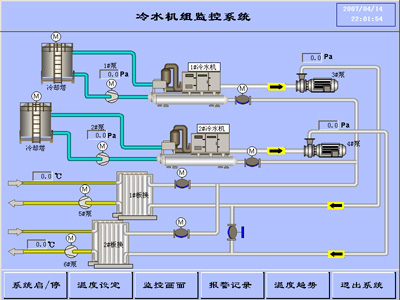 上位機(jī)軟件采用的是“三維力控”的組態(tài)軟件為開發(fā)平臺(tái),包含動(dòng)態(tài)顯示、報(bào)警、控件、趨勢(shì)、網(wǎng)絡(luò)通訊等組件,只需編寫少量的代碼即可生成高質(zhì)量的控制系統(tǒng)。整套系統(tǒng)建設(shè)有實(shí)時(shí)監(jiān)控畫面,包括主監(jiān)控畫面、系統(tǒng)啟停、溫度設(shè)定、報(bào)警記錄、趨勢(shì)圖。其通過顏色的變化來表明設(shè)備運(yùn)行狀態(tài),狀態(tài)分:無備妥、備妥、運(yùn)行、報(bào)警四種,相應(yīng)的顏色為:白、黃、綠、紅色閃爍。機(jī)組啟停分連鎖、解鎖兩種狀態(tài)。在設(shè)備運(yùn)行方式為解鎖時(shí),用鼠標(biāo)點(diǎn)擊畫面上相應(yīng)設(shè)備,便彈出啟停對(duì)話框,點(diǎn)擊電機(jī)啟動(dòng)按鈕可啟動(dòng)現(xiàn)場(chǎng)設(shè)備。傳感器的瞬時(shí)值依據(jù)實(shí)際安裝位置被分別標(biāo)注到不同的分布工藝流程圖中,其歷史數(shù)據(jù)被保存到相應(yīng)的歷史數(shù)據(jù)庫(kù)中,在趨勢(shì)圖中可檢索查詢。整個(gè)軟件界面簡(jiǎn)潔直觀,查閱、操作簡(jiǎn)便。