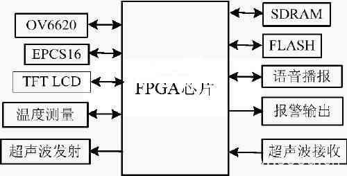 車輛電子后視鏡系統(tǒng)的電路框圖如圖1所示。整個系統(tǒng)可劃分為圖像采集及轉(zhuǎn)換、圖像及信息顯示、超聲波測距、語音播報及警告、溫度測量等部分。 CMOS圖像傳感器OV6620將采集到的圖像數(shù)據(jù)送到FPGA中,處理后得到RGB888格式的數(shù)據(jù),經(jīng)LCD控制電路送往LCD屏上顯示。超聲波測距電路共有左右兩個通道,利用頻率為40kHz和25kHz兩種超聲波脈沖測量障礙物的距離及車輛的相對速度,隨后進(jìn)行危險評估再將相關(guān)的信息顯示在LCD 屏上,并播報距離測量結(jié)果,然后控制報警電路發(fā)出急促程度不同的警示音。