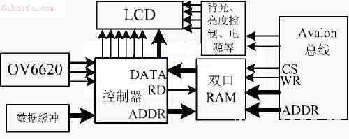 本設(shè)計(jì)中采用三星公司3.5 吋分辨率為320×240 的TFT 液晶屏(型號LTV350QV-F04), 設(shè)計(jì)中將顯示屏分為兩部分:上部16行用于顯示測得的距離、速度、當(dāng)前狀態(tài)等信息,下部224 行顯示車輛后方的圖像。為了提高顯示刷新速度、降低CPU占用率,LCD顯示控制由硬件電路實(shí) 現(xiàn),電路框圖如圖4所示??刂破骼肙V6620 輸出的行同步信號、場同步信號、像素時鐘等信號產(chǎn)生控制LCD屏所需的控制信號;此外,該控制器包含一個行同步信號計(jì)數(shù)器及雙口RAM地址發(fā)生器,兩者都在每個場信號到來時清零,然后行計(jì)數(shù)器對行同步信號計(jì)數(shù),當(dāng)計(jì)數(shù)值在 16~240 之間時控制器將數(shù)據(jù)緩沖器中的圖像數(shù)據(jù)送到LCD模塊,當(dāng)計(jì)數(shù)值在0~15之間時將雙口RAM中的數(shù)據(jù)依次讀出來送LCD屏顯示。框圖中的雙口RAM對微控制器來說是只寫的,在場信號到來并延遲一段時間后(大于LCD完成16行數(shù)據(jù)顯示時間), NiosII 將測得的障礙物距離、速度等需要更新的顯示數(shù)據(jù)寫入雙口RAM中;對LCD控制器來說,此雙口RAM是只讀的,并且是在每場開始的16行才讀取數(shù)據(jù),因此不會出現(xiàn)讀寫沖突的情況。這種設(shè)計(jì)大大減輕了NiosII 處理器的占用率,使得系統(tǒng)有足夠的時間完成其它任務(wù)。