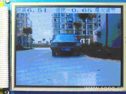 以Altera的DE2開發(fā)板為實(shí)驗(yàn)平臺,利用該平臺上兩個通用I/O擴(kuò)展槽外接實(shí)驗(yàn)電路板完成了本系統(tǒng)的設(shè)計(jì)驗(yàn)證。實(shí)驗(yàn)表明對于平面物體本系統(tǒng)超聲波測距范圍最小為7cm, 最大測量范圍大于10m ,距離為2.5m以內(nèi)時,測量誤差不大于±1cm;語音提示清晰,LCD屏顯示的圖像清晰穩(wěn)定。系統(tǒng)工作情況如圖7所示,表示距障礙物(圖5中車輛)距離為6.51m 、速度0.65m/s、當(dāng)前處于曝光時間調(diào)節(jié)狀態(tài),速度是負(fù)值表示接近中。
