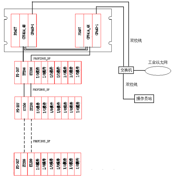ET-200作為從站連接到Profibus-DP,適用于冗余系統(tǒng)。每個(gè)ET200后面帶有所需的數(shù)字量I/O模塊和模擬量I/O模塊。接收來看現(xiàn)場(chǎng)的信號(hào),通過Profibus-DP總線連接到CPU,供CPU處理。