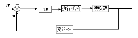 為了保證噴吹量的穩(wěn)定,需保持噴吹罐內(nèi)壓力的穩(wěn)定,通過調(diào)節(jié)補(bǔ)壓調(diào)節(jié)閥的開度可保持罐壓在設(shè)定范圍之內(nèi)。補(bǔ)壓設(shè)定值與罐壓實(shí)測(cè)值比較運(yùn)算后,通過罐壓調(diào)節(jié)畫面設(shè)定輸出補(bǔ)壓調(diào)節(jié)閥的開度。功能框圖見圖2。