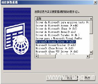 (圖5)的驅(qū)動程序列表中選擇“Microsoft Access Driver(*.mdb)”,并單擊“完成”按鈕,在隨后出現(xiàn)的對話框(圖6)中的“數(shù)據(jù)源名(N)”一欄中創(chuàng)建DSN 的名稱,并單擊“選擇”按鈕選擇需要訪問的數(shù)據(jù)庫,按“確定”按鈕結(jié)束。