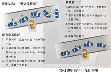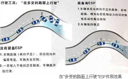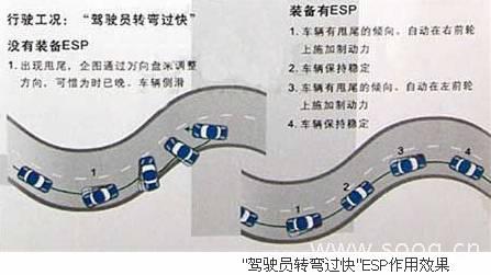 ESP是英文Electronic Stability Program的縮寫,是能有效避免車輛側(cè)滑的電子穩(wěn)定程序。電子穩(wěn)定程序(ESP)是一項主動安全系統(tǒng),它包含有了ABS和TCS,因此它能有效防止車輪在制動時抱死(ABS),在啟動時打滑(TCS)。ESP系統(tǒng)按照每秒25次的頻率檢測駕駛員意圖和車輛的實際行駛情況。如果發(fā)現(xiàn)有緊急情況,它迅速反應(yīng),通過液壓調(diào)節(jié)器,調(diào)節(jié)每個車輪上的制動壓力,如有可能,還會干預(yù)發(fā)動機和傳動系統(tǒng),防止車輛側(cè)滑,從而降低事故發(fā)生率。
