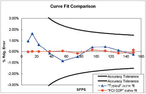 當熱式傳感技術在一致性和穩(wěn)定性方面不斷發(fā)展時,信號處理及硬件方面也有了突破性進展。FCI在標定數據收集和信號處理方面取得了進展,并且通過先進的曲線擬合演算法逐步提高了產品性能。下圖展示了FCI突破性的曲線擬合方法,這種方法提高了產品性能和精度。從圖1的常見誤差差頻寬可以看出傳統(tǒng)型產品的局限性。而采用D2P曲線擬合方法的FCI的熱式質量流量計,與傳統(tǒng)型產品形成了鮮明對比。近年來,誤差和不確定性縮減有了重大進展,使FCI產品在保持1001量程比的前提下,達到了0.5%的標定精度。