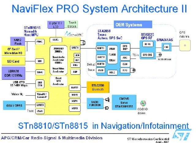 NaviFlex平臺為ST為車載Telematics系統(tǒng)設計的開發(fā)平臺,其主要硬件架構包括多媒體應用處理器和GPS接收器,并支持廣泛的外圍接口。除了在功能上能滿足車載收音機、導航、車內連結功能、影音播放媒體設備、移動電視和后座娛樂等需求外,NaviFlex的定制化特征實現(xiàn)了產品較大彈性,有助于加快具有特定需求產品的上市速度。