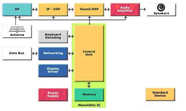 Telematics系統(tǒng)的主控制器/處理器要通過UART等接口來連結Bluetooth、2G/2.5G/3G無線通信、DSRC,還包括單向接收的無線技術GPS、AM/ FM、DVB-T/DVB-H/T-DMB等各種無線模塊。因此,Telematics系統(tǒng)設計上的一大挑戰(zhàn)就是這些通信模塊的天線、射頻(RF)和基帶(BB)三部分的整合。