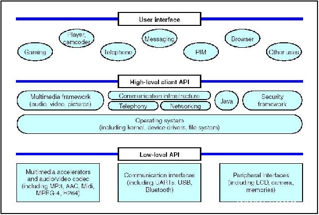 底層硬件設備包括多媒體加速器/音視頻編譯碼器、UART接口、USB接口、Bluetooth等通訊接口,以及LCD控制器、照相機等一般性應用的標準硬件接口;中間部分主要包含處理核心、設備驅動程序和文件系統(tǒng)的操作系統(tǒng)功能,以及多媒體架構、語音及網(wǎng)絡的通訊架構、Java和安全性架構等;語音、游戲、短信、瀏覽、PIM等功能位于上層的應用軟件部分。
