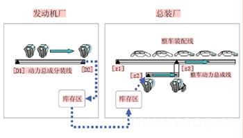 如圖1所示,發(fā)動(dòng)機(jī)動(dòng)力總成在發(fā)動(dòng)機(jī)廠進(jìn)行分裝(D1~D2之間),然后運(yùn)輸至總裝整車裝配線;總裝線需在Z2~Z3之間進(jìn)行動(dòng)力總成其他部件的裝配,然后在Z3點(diǎn)將動(dòng)力總成裝配到大線的車身上。