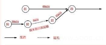 如圖3所示,從Z1到Z3裝配時(shí)間為60min,而D1點(diǎn)較Z1點(diǎn)提前60min獲得排序信息,所以D1到Z3的產(chǎn)品生產(chǎn)周期必須小于120min,而Z2到Z3的生產(chǎn)時(shí)間為45min,所以從D1到Z2的生產(chǎn)(即動(dòng)力總成分裝完成送到Z2工序)時(shí)間必須小于75min。