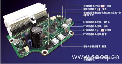 圖3所示的安全氣囊控制模塊包括了用于碰撞傳感/安全氣囊控制和慣性傳感/電子穩(wěn)定性控制的傳感器。