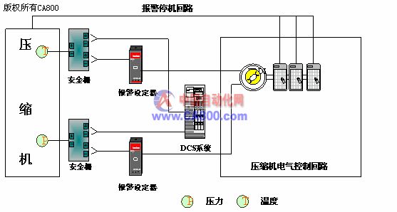 壓縮機的連鎖停機控制很重要,用報警設(shè)定器代替原有電氣控制柜電-Ⅱ型儀表,改為低電壓(24V)控制,在新的電氣控制柜中增加24V繼電器,控制壓縮機的運行;利用報警設(shè)定器的模擬輸出既保證信號的采集,又能完成壓縮機的報警保護。在正常情況下,一旦壓縮機運行,就不要求停機。報警設(shè)定器可解決在計算機出現(xiàn)故障或需要維護系統(tǒng)時,不停機控制壓縮機的運行。這樣即使在自控系統(tǒng)或計算機停止運行時,壓縮機也能正常運行,減少了壓縮機停機時間。