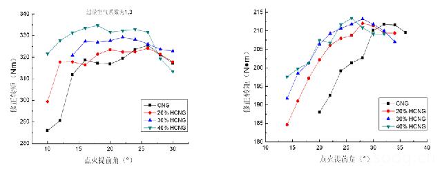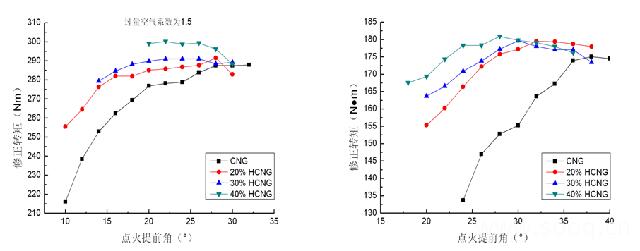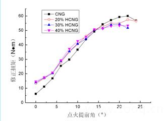 從圖5、圖6可以看出在相同燃料低熱值相同過量空氣系數(shù)條件下HCNG燃料摻氫量越大,MBT(Maximum Brake Torque Timing)點(diǎn)越靠近上止點(diǎn),最大修正轉(zhuǎn)矩越大,主要原因是摻入的氫氣提高了燃料的燃燒速度,提高了發(fā)動(dòng)機(jī)的等容度,從而增加了發(fā)動(dòng)機(jī)的有效效率。同CNG燃料相比,推遲點(diǎn)火提前角時(shí),HCNG燃料的修正轉(zhuǎn)矩降幅較小,這一特點(diǎn)使HCNG燃料可以通過推遲點(diǎn)火提前角來降低NOX排放。